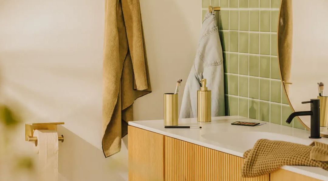 El dorado ha vuelto, pero en versión cepillada: más calmada, táctil y fácil de integrar. En accesorios de baño, el acabado oro cepillado PVD aporta color sin estridencias y aguanta el ritmo del día a día.